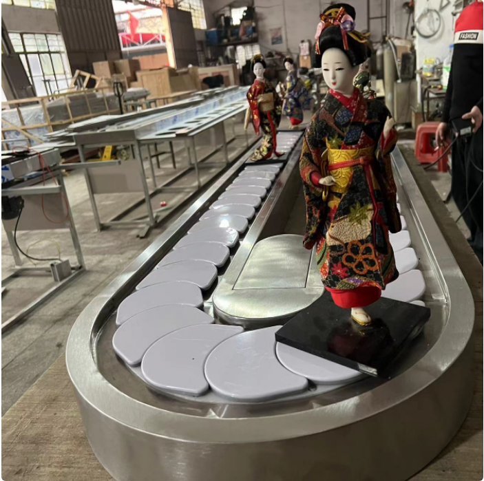 本产品采用不锈钢轨道及亚克力荷叶片,放在火锅店就是火锅设备,客人坐在座位上可以享受多种美食,放在超市珠宝店就可以展示不同的商品,贵客站在同一个地方可以欣赏到多种商品及每一个角度。