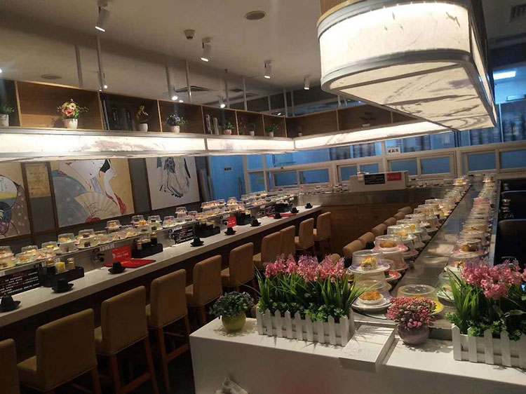 回转寿司输送带设备可以根据店面的布局和客户的要求设计任何形状。餐台面可以根据店面布局或者客户的要求设计各种风格。餐台面的装饰材料可以有很多选择,如不锈钢,大理石,led灯等等,客户可以选择在当地自行装饰。