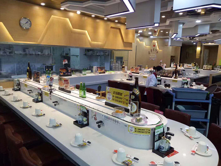 石材轨道旋转寿司设备可以根据店面的布局和客户的要求设计任何形状。餐台面可以根据店面布局或者客户的要求设计各种风格。餐台面的装饰材料可以有很多选择,如不锈钢,大理石,led灯等等,客户可以选择在当地自行装饰。