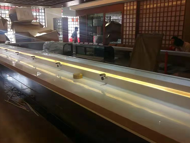 石材质地的回转寿司拉带让在桌面上食用寿司会有滋味醇厚感觉,这是一种对食物的感情,创造出高档的店面气氛。石材拥有永恒、独特的外观;材料本身颜色具备个性,有较高的视觉价值;耐用,刮伤后可重新抛光。人造石还具备经济、环保、真正无缝接拼等优点。LED灯的回转寿司拉带材料色彩繁多,风格鲜明的颜色,优美的色泽,精致的花纹,并有高度抗磨损性,并可和周围其他布置浑然一体,现已成为一种时尚步入人们的生活。可内置灯光,变换的多种色泽,绿如翡翠、红如宝石、蓝如碧,其绚丽的镭射图案和炫目的光芒,更能增添欢乐气氛。