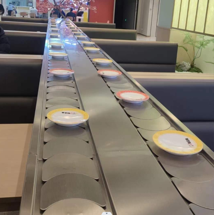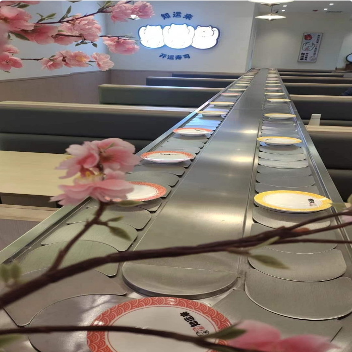 其中,不锈钢回转寿司拉带设备特点是:轻便、不生锈。与现代美观实用相结合,满足喜爱金属质感的消费客,颇受消费者青睐。