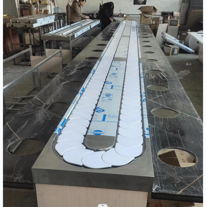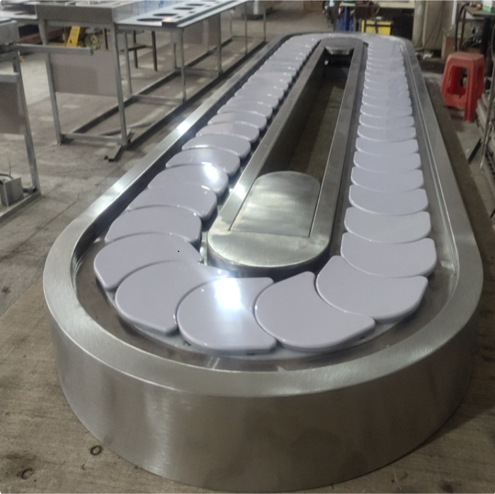 本产品采用不锈钢轨道及亚克力荷叶片,放在火锅店就是火锅设备,客人坐在座位上可以享受多种美食,放在超市珠宝店就可以展示不同的商品,贵客站在同一个地方可以欣赏到多种商品及每一个角度。