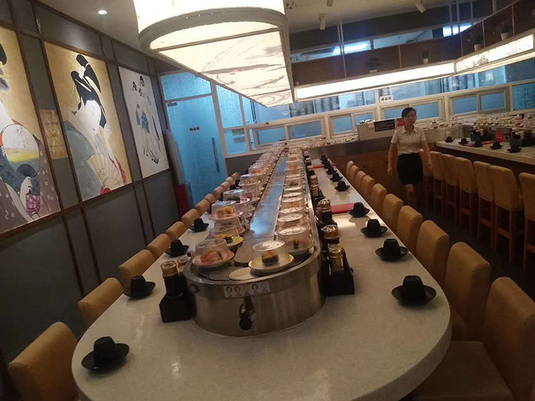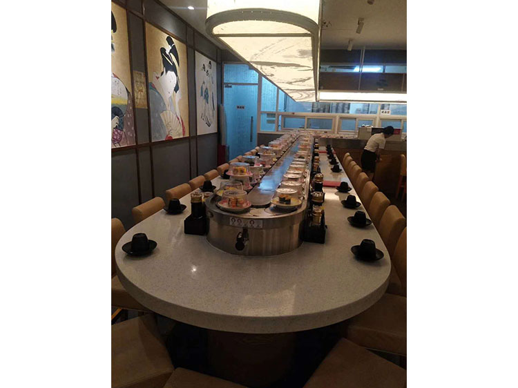 石材质地的回转寿司拉带让在桌面上食用寿司会有滋味醇厚感觉,这是一种对食物的感情,创造出的店面气氛。石材拥有永恒的外观;材料本身颜色具备个性,有较高的视觉价值;,刮伤后可重新抛光。人造石还具备经济、环保、真正无缝接拼等优点。