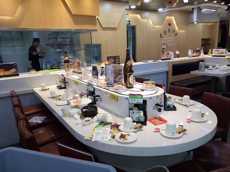 石材轨道旋转寿司设备可以根据店面的布局和客户的要求设计任何形状。餐台面可以根据店面布局或者客户的要求设计各种风格。餐台面的装饰材料可以有很多选择,如不锈钢,大理石,led灯等等,客户可以选择在当地自行装饰。