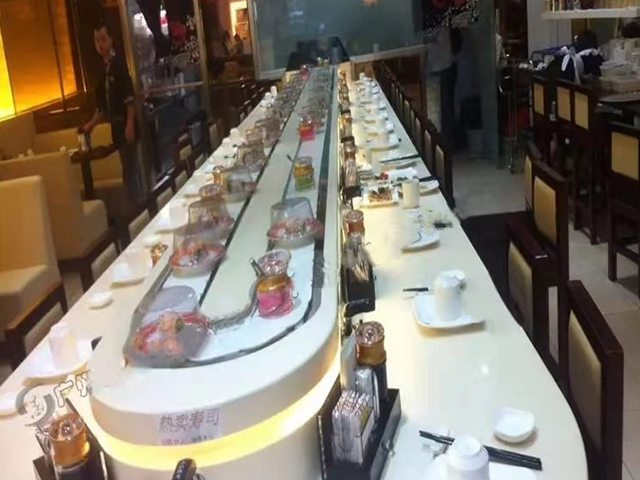 石材质地的回转寿司拉带让在桌面上食用寿司会有滋味醇厚感觉,这是一种对食物的感情,创造出高档的店面气氛。石材拥有永恒、独特的外观;材料本身颜色具备个性,有较高的视觉价值;耐用,刮伤后可重新抛光。人造石还具备经济、环保、真正无缝接拼等优点。LED灯的回转寿司拉带材料色彩繁多,风格鲜明的颜色,优美的色泽,精致的花纹,并有高度抗磨损性,并可和周围其他布置浑然一体,现已成为一种时尚步入人们的生活。可内置灯光,变换的多种色泽,绿如翡翠、红如宝石、蓝如碧,其绚丽的镭射图案和炫目的光芒,更能增添欢乐气氛。